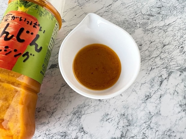 ボトルをしっかり振ってから注げば、すりおろし野菜のドロッとした濃厚な質感と、鮮やかなオレンジ色が食卓を彩ります。