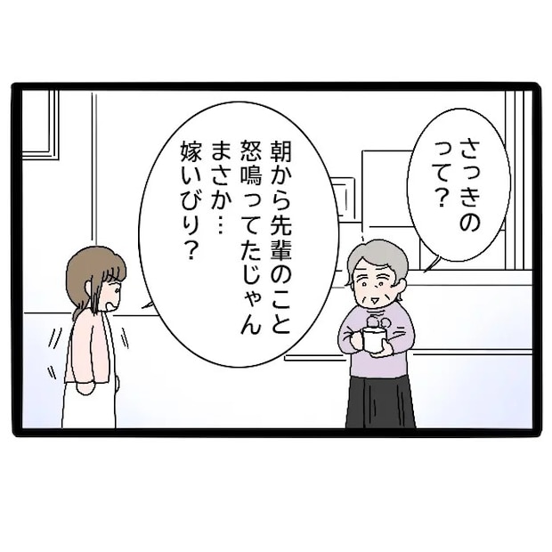 「さっきのどういうこと?」と切り出すと、母は「さっきのって?」ときょとんとしていたので、私はストレートに「朝から先輩のこと怒鳴ってたじゃん。まさか・・嫁いびり?」と聞きました。