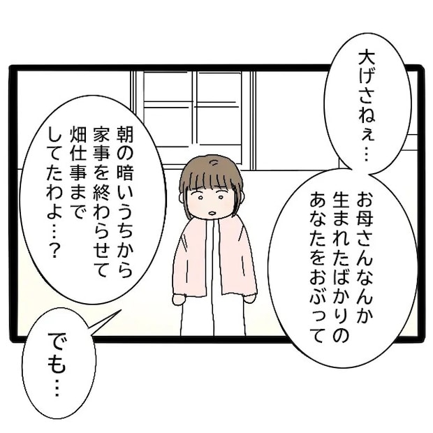 しかし、母は「大げさねぇ・・お母さんなんか生まれたばかりのあなたをおぶって朝の暗いうちから家事を終わらせて畑仕事までしてたわよ・・?」と自分の昔の話を出してきました。自分もそうしてきたのだから嫁もやって当然という考えのようです。母が大変な思いをして頑張ってきたことはわかりますが、それを先輩にも押し付けるのはやっぱり違う気がして「でも・・」と言いかけた私。