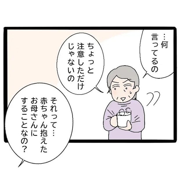すると、母はちょっと気まずそうに「・・何言ってるの。ちょっと注意しただけじゃないの」と嫁いびりを否定したので「それって・・赤ちゃん抱えたお母さんにすることなの?」と詰め寄りました。