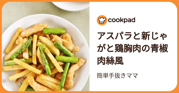 皮付のじゃがいもを細切りにした皮付きのじゃがいもと、そぎ切りにした鶏胸肉などを青椒肉絲風にアレンジ!緑のアスパラがいいアクセントに。