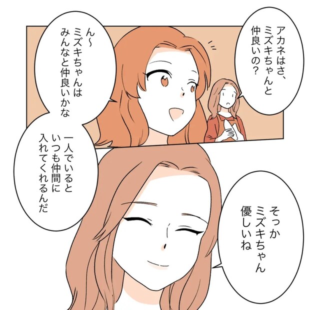 カエデは、娘のアカネにシズクの娘ミズキのことを聞いてみました。「アカネはさ、ミズキちゃんと仲いいの?」するとアカネは「ミズキちゃんはみんなと仲良いかな。1人でいるといつも仲間に入れてくれるんだ」と元気に答えました。「そっか。ミズキちゃん優しいね。」アカネの様子から少し安心したカエデです。