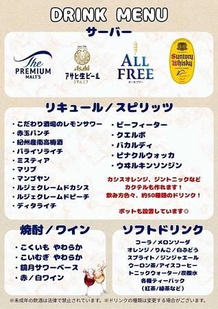 飲み放題バーカウンターでは、生ビールサーバー、炭酸水サーバー、ノンアルコールビールサーバー、ウィスキーサーバーのほか、リキュール、スピリッツ、焼酎、ワイン、ソフトドリンクなど約50種類がラインアアップされており、カシスオレンジ、ジントニック等のカクテルも作ることができる。