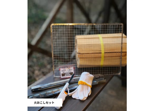 火おこし道具は、着火剤、軍手、薪、火ばさみ、チャッカマン、鉄板、網、トングなど、BBQに必要な備品がセットに。炭はセットに含まれていないので、必要な場合は持ち込むか、売店にて購入しよう。