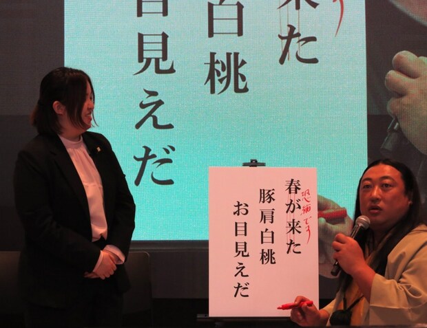 ジョイフル社員が詠んだ「春の新メニュー俳句」を即興で講評する俳句ショーでは、「春が来た 豚肩白桃 お目見えだ」という句を、秋山芭蕉が「恐縮です 豚のお肩と 白い桃」と添削。軽快なやりとりで会場を盛り上げながら、新メニューの魅力を発信した。