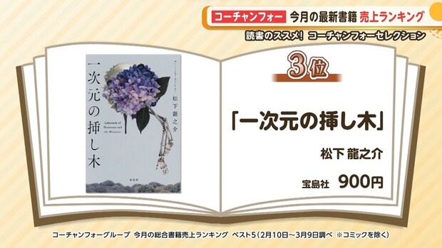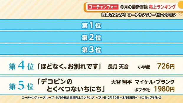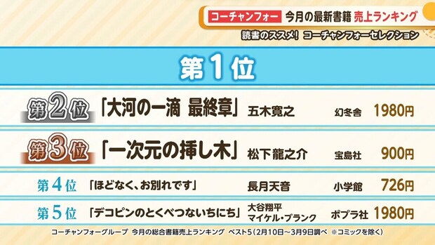 大野アナ:コーチャンフォー今月の書籍売上ランキングはご覧の通りです。第3位の作品以外は今回初めてランクインしました。