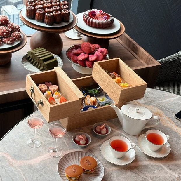 さあ、アフタヌーンティーの登場です。フェアモント東京では常時2種類のアフタヌーンティーを提供しており、今日は和のアフタヌーンティーをいただきます。席に着くと、大きな木箱が運ばれてきました。