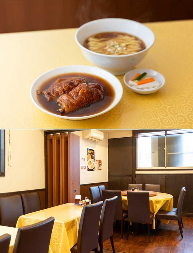こんな細い路地奥に店があったのか!? と誰もが驚く、70年という長い歴史を重ねてきた広東料理店・徳記。リニューアルしてから四川料理も味わえるようになったが、変わらず人気なのは、とろっとろの豚足を合わせたそば。豚と鶏のあっさりスープ&自家製の平打ち麺に、八角が香る豚足のセットで、それぞれで食べても、合わせて食べてもおいしい。