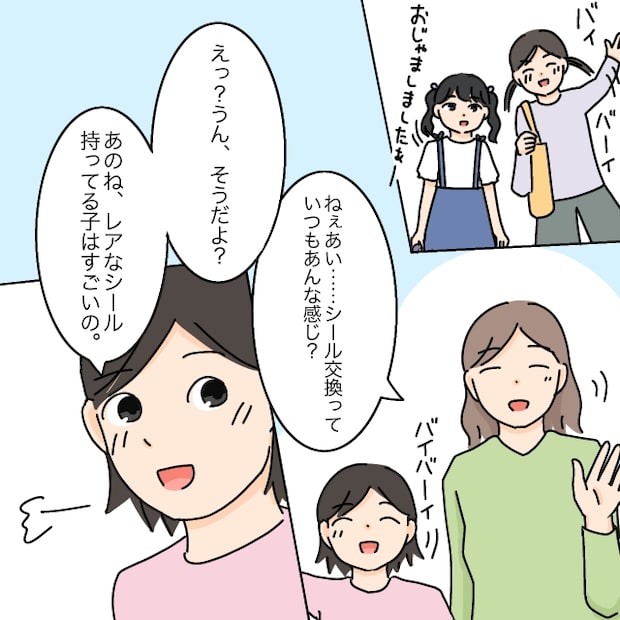 時刻はすっかり夕暮れ時。「おじゃましました」と帰っていくあいの友達に手を振りながら、私はふと気になって「シール交換っていつもあんな感じなの?」と聞いてみます。するとあいは当たり前のような表情で「そうだよ?レアなシール持ってる子はすごいの」と言いました。