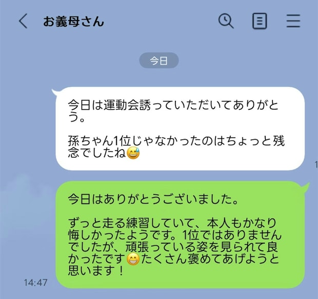 義母の発言にモヤモヤ、イライラしたという経験を持つ方もいるのではないでしょうか。自分のことであればまだしも、子どもへの言葉には怒りを抑えられないものですよね。この記事では、運動会に義母を誘って行ったが順位ばかりを気にする発言にイライラしたという投稿を紹介します。徒競走でゴールする姿を見て「1位じゃなかったね」とLINEをしてきたり、子どもにも当たり前のように順位の話をしてしまう義母にモヤモヤしたという投稿者さん。順位よりも子どもの頑張りをもっと見てほしいと感じたそうです。