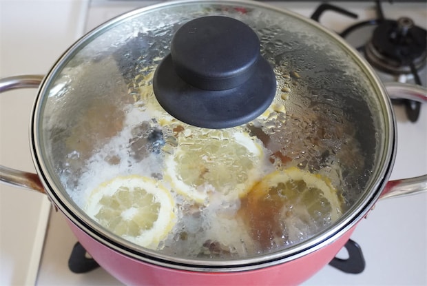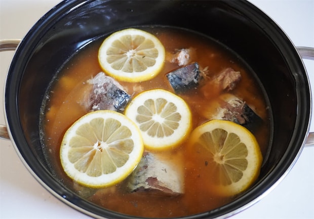 2. 1の鍋にしょうゆとサバ缶を汁ごと加え、レモン半分を5mm幅の輪切りにして上にのせる。