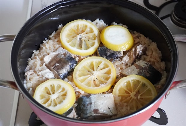 サバの旨味とレモンの風味がご飯に染みて、味わい深いおいしさです。レモンの酸味のおかげで、サバの臭みはあまり気になりません。