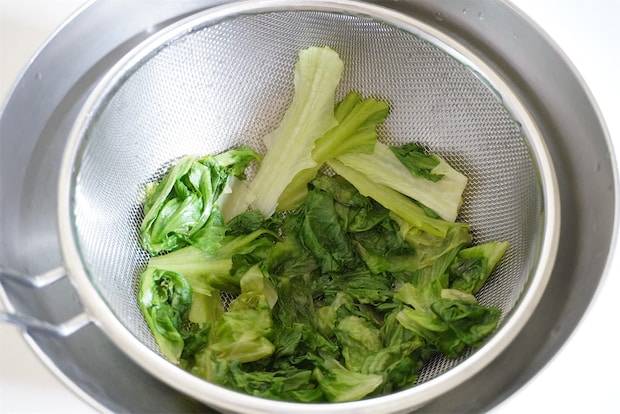 ザルにあげて水気を絞り、芯の部分はざく切りにします。