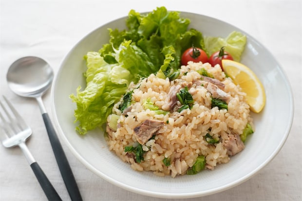 時短と節約にもなり、サバの旨味と栄養をたっぷり味わえる「グリーンリーフとサバ缶とレモンのごはん」。