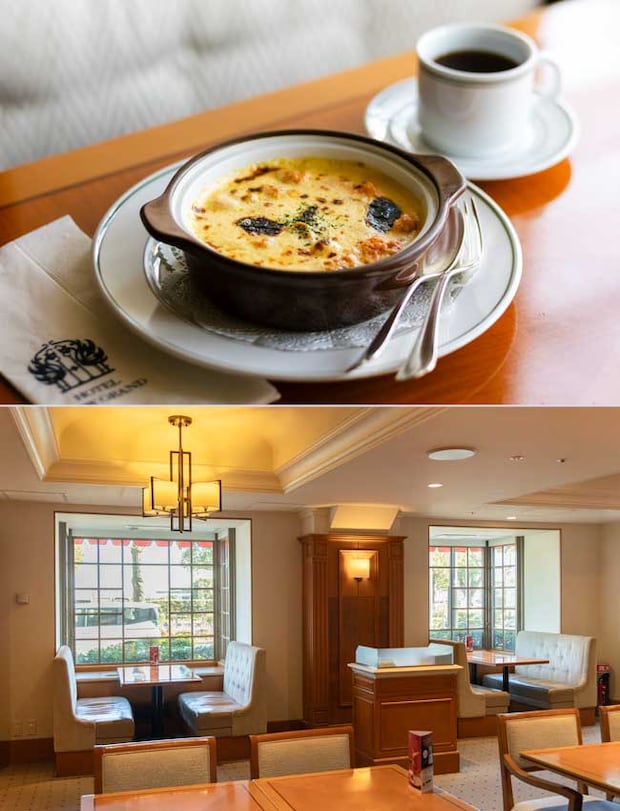 昭和初期、「ホテルニューグランド」の初代総料理長が体調を崩したお客様のために作り誕生したシーフードドリア。現在もその味を受け継ぎ提供している。バターライスの上に、魚介のうまみを凝縮したソースなど2種のソースをかけて焼きあげた1皿は、なめらかでひと口ごとに優しさが広がる。