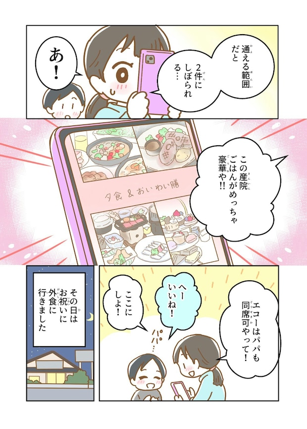 産院選びで「ご飯の豪華さ」や「パパのエコー同席可」を重視するのも、プレママ・プレパパあるあるで、大きく頷きながら読んだ方も多いのではないでしょうか。これから赤ちゃんに会うための準備が、少しずつ始まっていきます。2人のわくわく感がひしひしと伝わるエピソードでした。