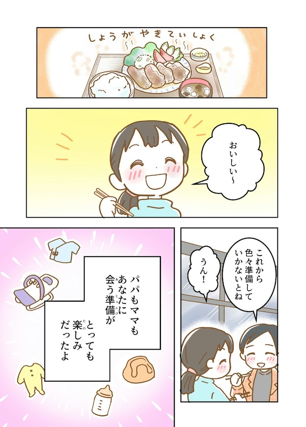 妊娠がわかった日の夜、ふたりでお祝いに外食(しょうが焼き定食)に行ったというエピソード、ご夫婦の仲の良さが伝わってきてほっこりしますね。
