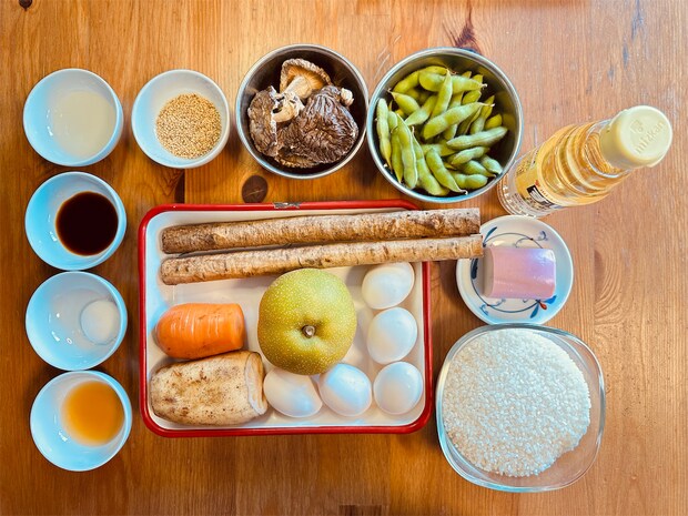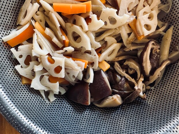 1. れんこんは薄いいちょう切り、にんじんは拍子木切りにする。干ししいたけはぬるま湯(分量外)で戻し、飾り用の2枚を取り分け大きめに切り、残りは薄くスライスする(しいたけの戻し汁は取っておく)。ごぼうはささがきにして水(分量外)でさらす。枝豆は塩ゆでにする。