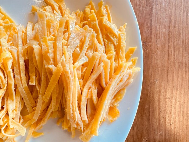 ボウルに卵を割り入れ、元レシピに記載はなかったのですがみりんと塩、各少々を加えます。フライパンに溶き卵を流し入れて薄焼き卵を作ります。まな板に移し、粗熱が取れたら細切りにします。