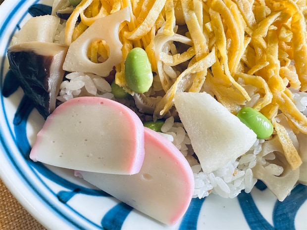 6. 5を器に盛り、錦糸卵、飾り用のしいたけと梨、薄切りにしたかまぼこをのせれば出来上がり。