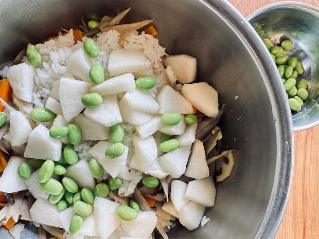 5. 米を炊いて寿司飯を作り、2と3を加え、1の枝豆、白ゴマを加えてさっくり混ぜる。
