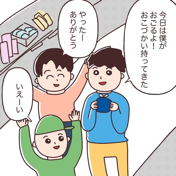 「今日は僕がおごるよ!おこづかい持ってきた」レン君がそう言うと、「やったーありがとう」「いえーい」と喜ぶカイト君とシュン君。