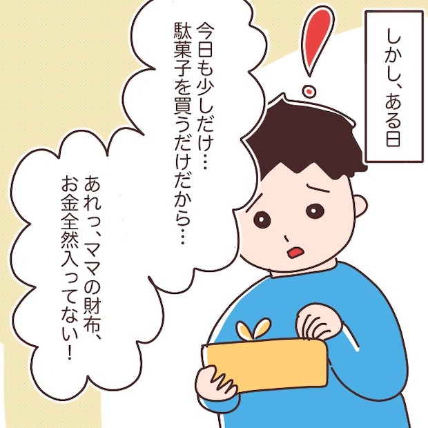 「今日も少しだけ・・。駄菓子を買うだけだから・・」そう思いながらお母さんの財布を開けるも、「あれっ、ママの財布、お金全然入ってない!」空っぽの財布を前にレン君は驚きました。