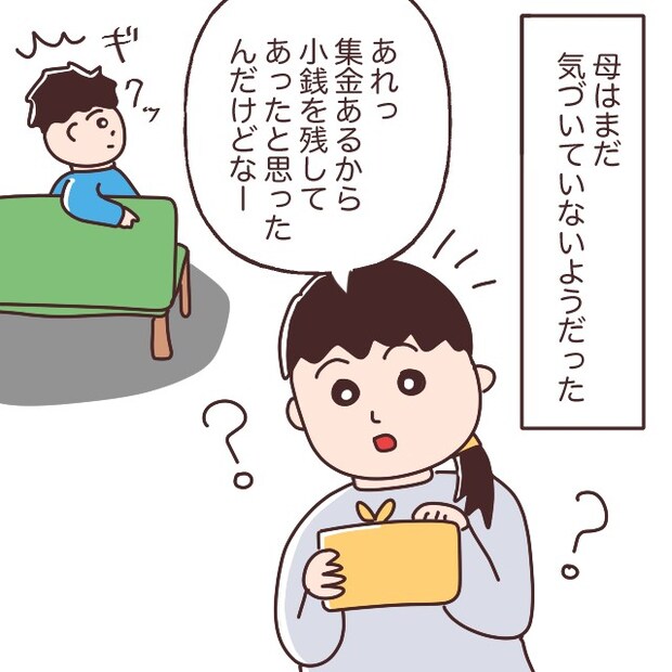 それでも、お母さんはまだ気づいていない様子で、「あれっ?集金あるから小銭を残してあったと思ったんだけどなー」と呟いている姿を見て、レン君はギクッとしていました。
