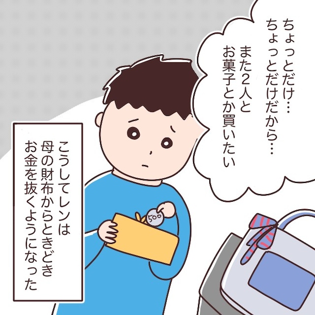 その後家に帰り、「ちょっとだけ・・ちょっとだけだから・・。また2人とお菓子とか買いたい」そう思いながら、レン君はお母さんの財布からときどきお金を抜き取るようになっていきました。