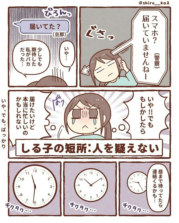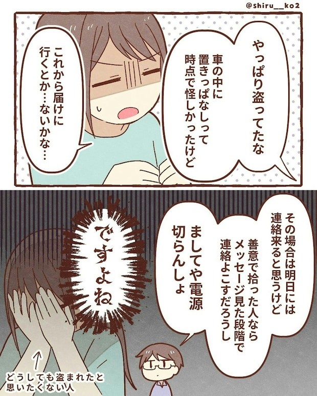 しる子さんが落としてしまったスマホを拾った人物、どうやら善意ではなかったようです。夫の張り込みのおかげで、スマホを拾った人物と車を特定することができました。