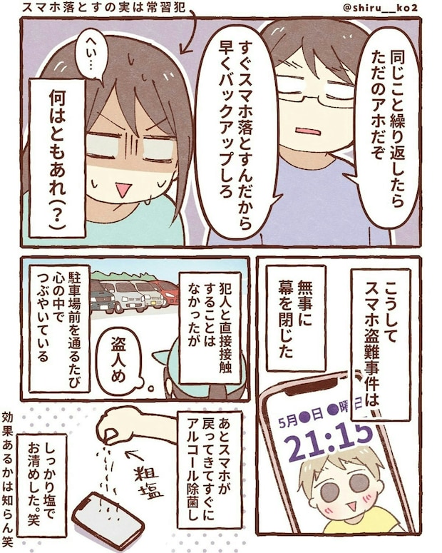 しる子さんのスマホ、無事に戻ってきて何よりでしたね。犯人がしたことは許せませんが、あの貼り紙が威力を発揮しようです。「知ってるよ、見てるよ」とプレッシャーをかけるのは、効果があるようです。