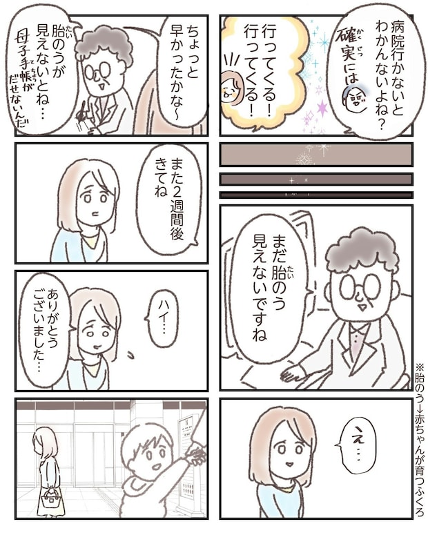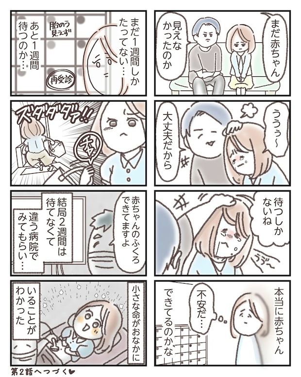 不安で涙をこぼすまゆこさんに、「大丈夫だよ」と声をかけて頭をなでる旦那さんの姿にも、ほっとさせられます。別の病院で無事に胎嚢が確認できたときの安心感は、きっとひとしおだったことでしょう。