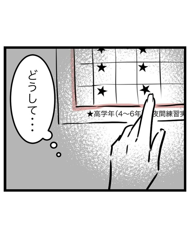 息子が4年生になり何度目かの夜間練習の日。車で待機していたもっつんさんのもとへ、突然コーチがやってきて「帰ってください」と告げました。息子が夜間練習に呼ばれていないと知ったもっつんさんは、動揺しつつも息子を連れて帰宅しました。