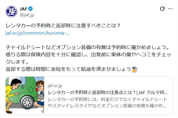 JAFはレンタカーの利用時に確認すべきことについて、「チャイルドシートなどオプション装備の有無は予約時に確かめましょう」「借りる際は保険内容を十分に確認し、出発前に車体の傷やヘコミをチェックします」と投稿。