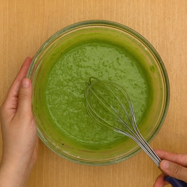 2. ボウルに砂糖、牛乳、サラダ油を入れて泡立て器でしっかりと混ぜる。ホットケーキミックス、抹茶を合わせてふるい入れ粉気がなくなるまで混ぜる。