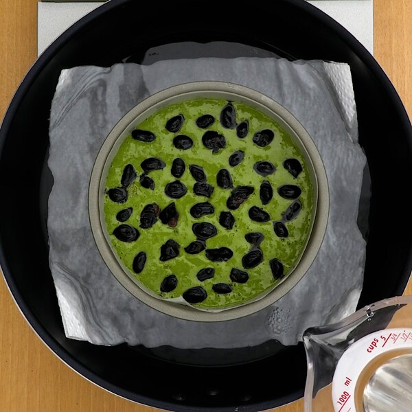 3. クッキングシートを敷いた型に流し入れて、5cmくらいの高さから2〜3回くらい型を落とし空気を抜き、黒豆をのせる。フライパンにクッキングペーパーを3枚重ねて敷き、型をのせて高さ1.5cm程度まで水を入れ、中火で加熱する。