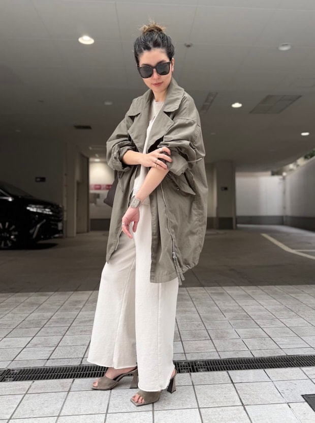 「白いスエットのセットアップで春気分のスタイリングに。ライダース風のコートをラフなスエットに羽織ることで強過ぎず女性らしい雰囲気で着こなしました。コートのカーキが柔らかいニュアンスカラーなので、白に羽織っても馴染みがよく相性がいい1枚です」