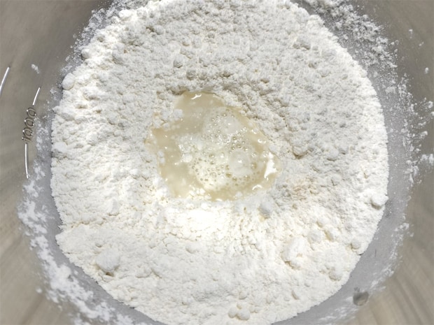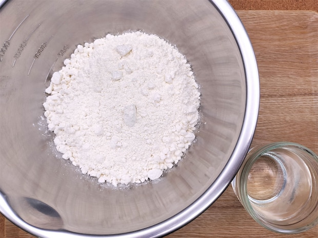 1. ボウルに薄力粉を入れて水を少しずつ加え、粉っぽさがなくなるまで手でこねます。