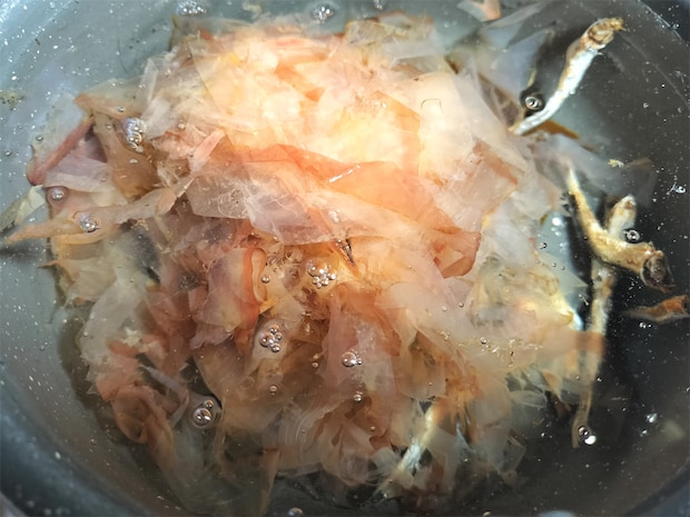 3. 鍋に水、煮干し、昆布、かつお節を入れ、5分ほど浸してから弱火にかけます。