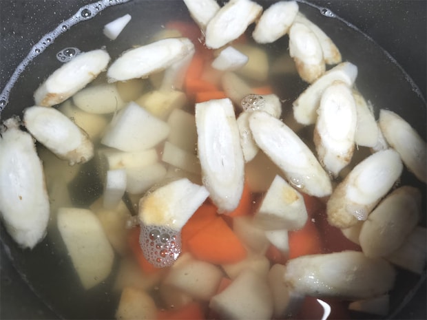 5. 鍋に4のだし汁、にんじん、大根、里芋、ごぼうを入れ、中火で10〜15分煮ます。