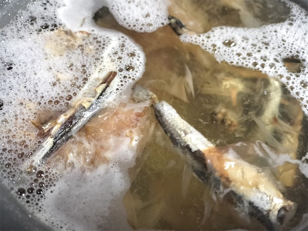 4. 沸騰したら昆布だけを取り出し、他はそのまま弱火で5分ほど煮出し、ザルで濾します。