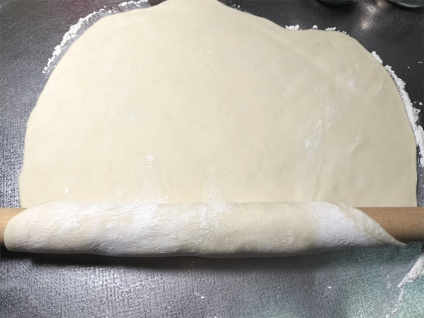 7. 麺棒で3mm~5mmの厚さになるまで伸ばして打ち粉を振り、麺棒に巻きつけます。