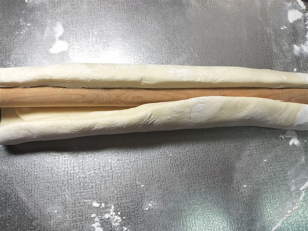 8. 麺棒に沿って包丁を入れ、切り開きます。