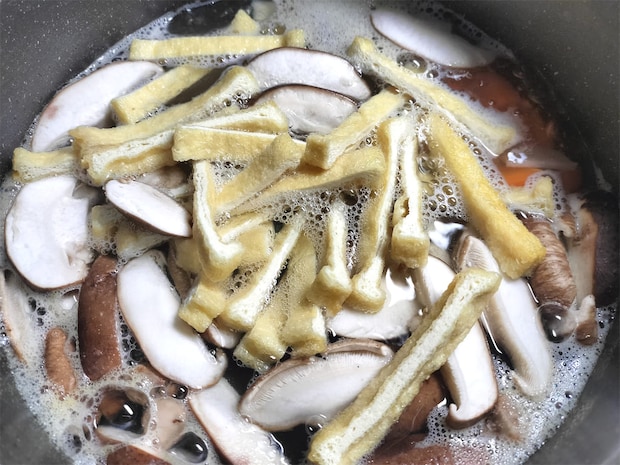 10. 5の鍋にしいたけと油揚げを加えます。