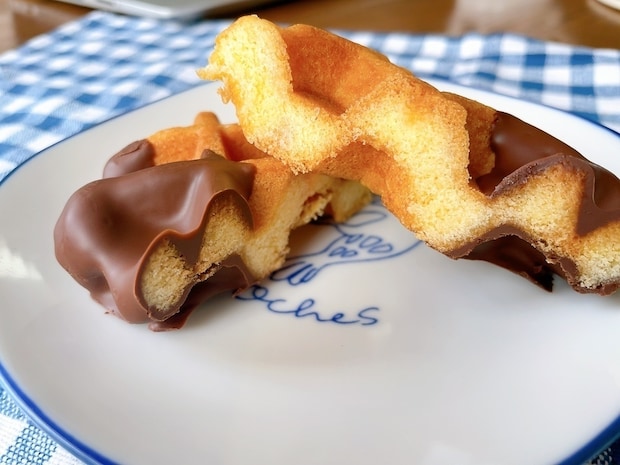 ビスキュイワッフルをホワイトチョコレートでコーティングしています。