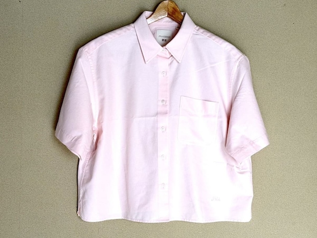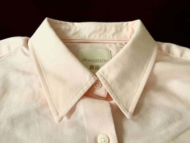 襟は一般的なボタンダウンではなく、小さめでシンプルなボタンを採用。左胸の大きめのポケットと、前裾のJW ANDERSONの刺繍ロゴがアクセントになっています。