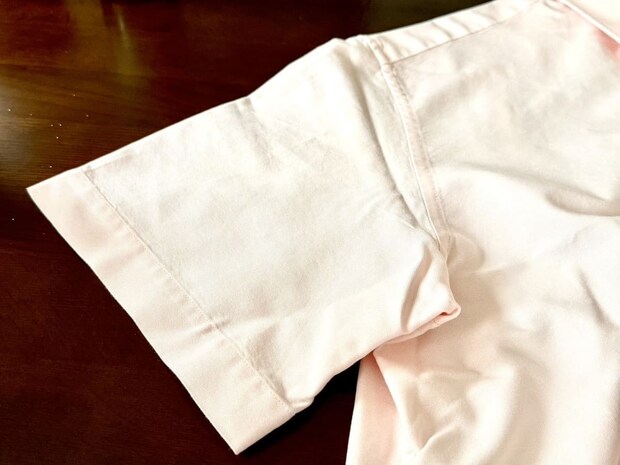適度な厚みで夏の透け感や汗染みも気になりにくく、洗濯後もシワになりにくいのが利点です(洗濯機・ドライクリーニング可、乾燥機不可)。
