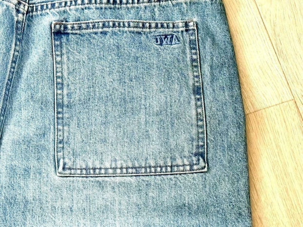5ポケット仕様で、やや大きめの右後ろポケットとウエストボタンには「JWA」のロゴが刻印されています。