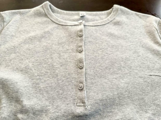首周りには5つの小さなボタンが付いたヘンリーネックが採用されており、汗ばむ季節には下にキャミソールを着てボタンを外し、チラ見せするスタイルもおすすめです。