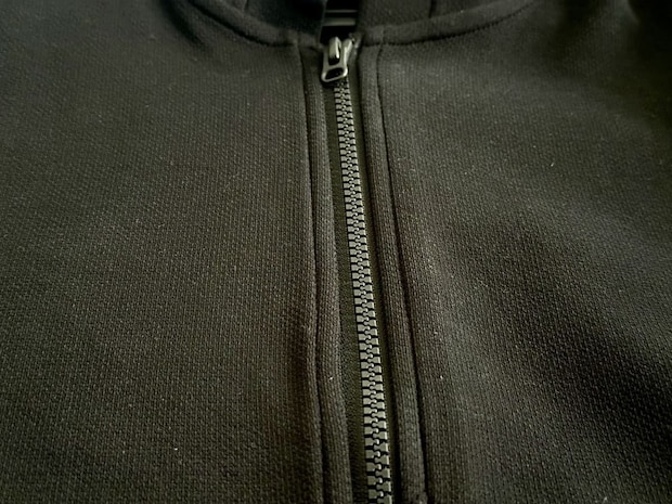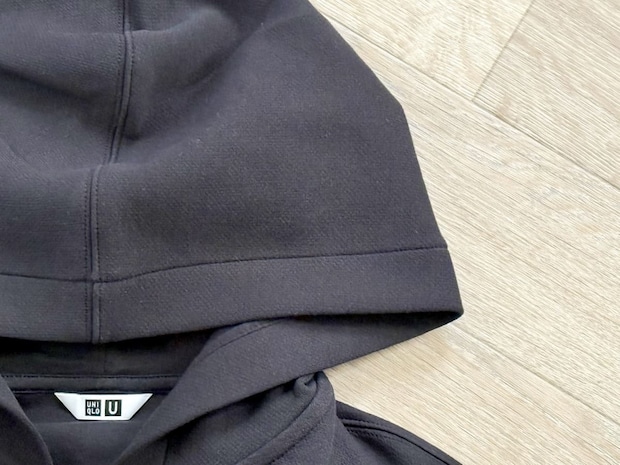 本体は綿67%、ポリエステル27%、ポリウレタン6%(フード裏とポケット部分は綿100%)で構成されており、ジャカード編みのようなしっかりとした生地感でありながら、サラリとしていてスウェット特有の重さを感じません。
